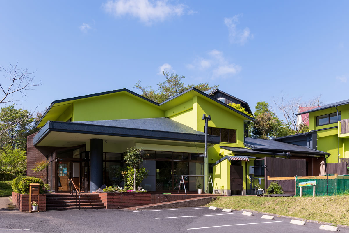 高千穂峰のふもと標高およそ500メートルの高原に広がる別荘地の中にあるピスタチオカラーの一軒宿でひときわ目立っています。